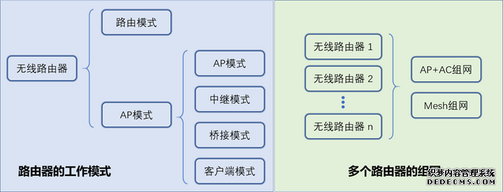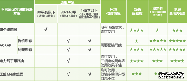 实际上,单个路由器、无线控制器(Access Control,AC)+无线接入点(Access Point,AP),电力线子母路由器和无线Mesh组网在部署上的区别,我们用一张简单的表格就可以一览无余: