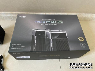 像是华硕新推出的灵耀Pro AX11000支持AiMesh2.0,且具有三频,其中一个频率是专门用于路由器之间的传输。并且采用双主机设计,两台主机的硬件设计完全相同,任意一台都可做为独立的路由器,从而实现大户型无缝WiFi漫游。 3. 一些使用和实测场景接下来是喜闻乐见的评测和开箱环节。 (1)开箱过程华硕灵耀 Pro AX11000 分布式路由包装盒采用灰色设计,整个包装盒做了金属灰光泽纹理,整个映入眼帘的感觉就是酷。包装盒中间印有产品渲染图,左上角印有 Wi-Fi 6 的标识,左下方还有产品的覆盖范围(最高可以覆盖560平方米)。