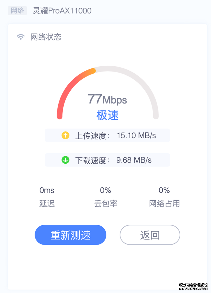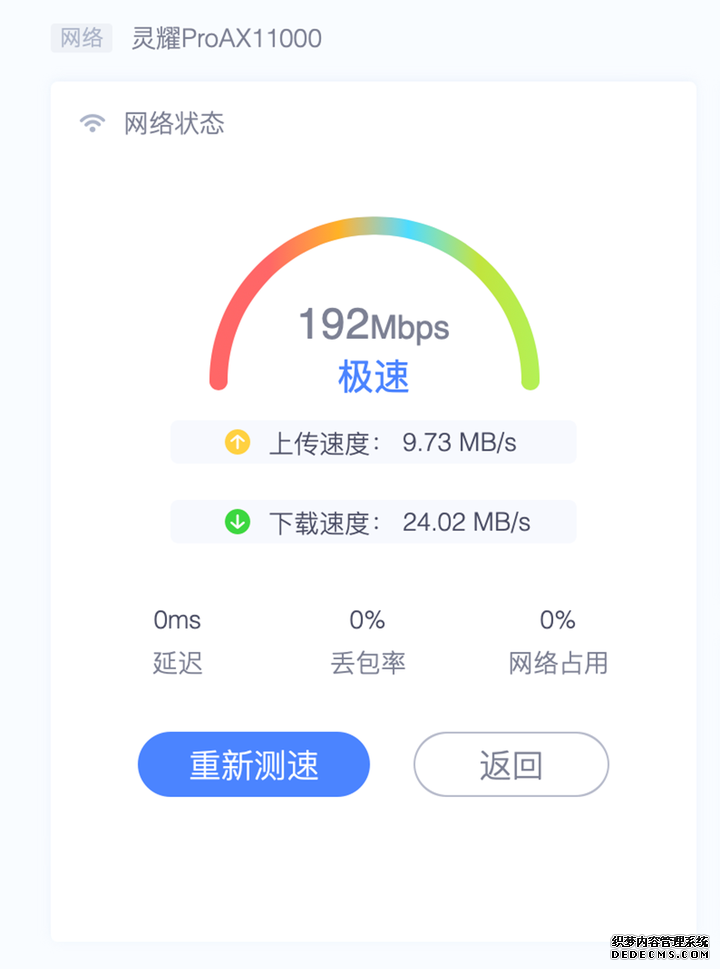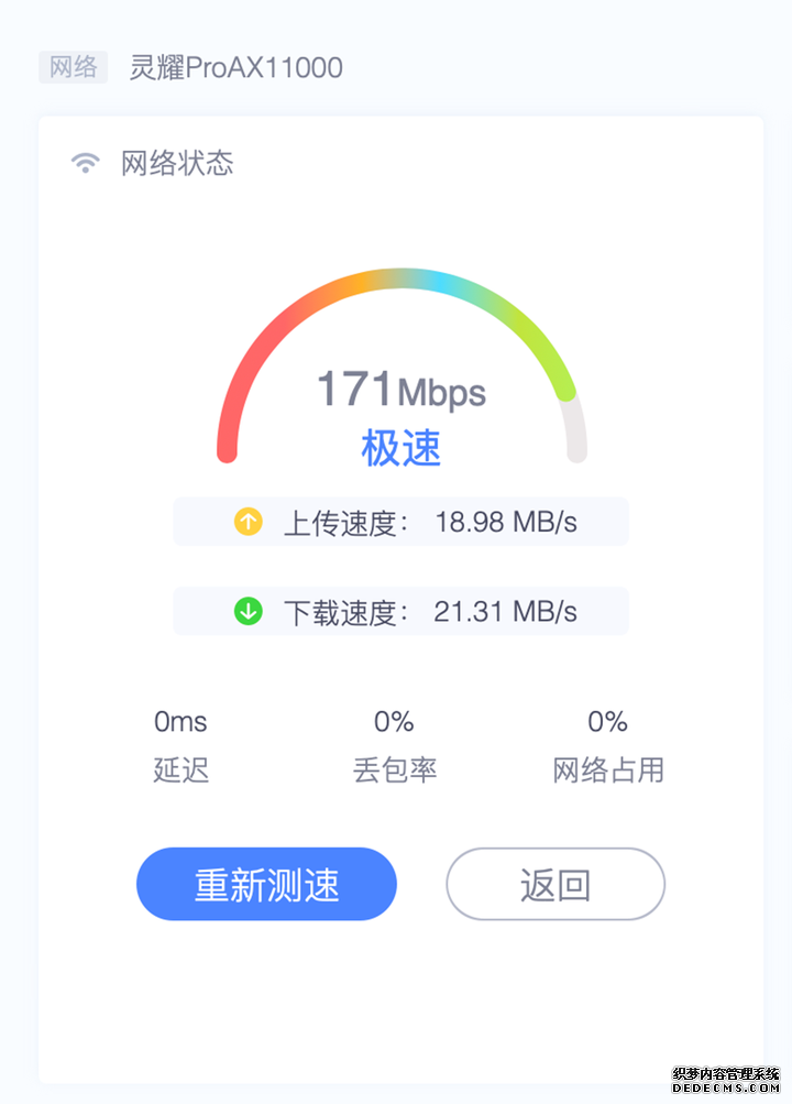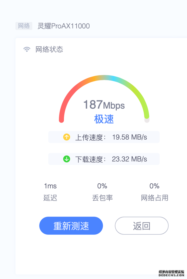 三频设计,5G网络专用回传线路,将连接无线终端的频段分开,大大提高了路由器的速率和稳定性。通过其自身app测试了一下网速,下载速度322M(自家宽带限制),抖动只有0.06ms。 (3)实测部分灵耀Pro AX11000最核心的点则是其强大的覆盖能力,能够满足大户型Wi-Fi覆盖的需求,那他的真实表现真如其宣传的这么强大吗?我们来实际测试一下。