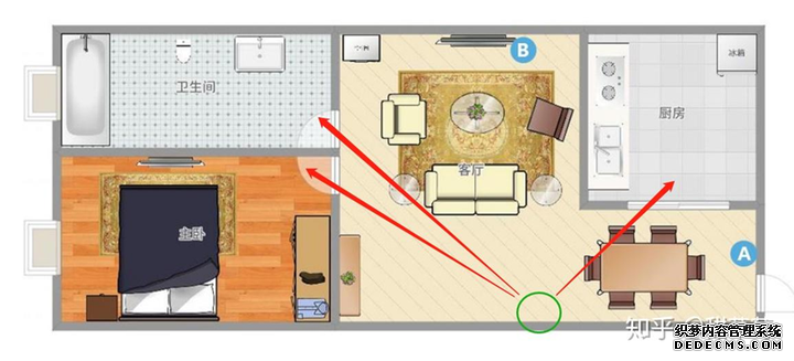 小户型房型,在合适的位置放置一个无线路由器即可 举个很直观的例子,对于上图中一室一厅的房型来说,由于房间内隔断较少,即使考虑到信号衰减的问题,但是找一个合适的位置放置一个足够强的无线路由器,也是可以保证主卧、卫生间和厨房都会有足够的信号强度。 当然,随着户型越来越大,加之万物互联时代家庭场景中的物联设备和可移动物联设备越来越多,从而导致对屋内信号覆盖面积的需求和链接切换场景也渐渐增加,如何利用现有设备完成较大范围内的快速组网,成为整个行业无论是上游厂商还是下游用户共同关注的话题。