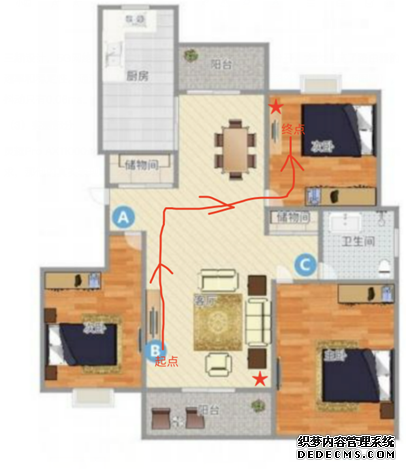 中/大户型需要放置AP进行补盲 继续用一个直观的例子来说明。在我们默认一个家庭往往只在客厅有一个AP的前提下,对于中户型甚至是大户型来说,很可能就会因为单路由器导致信号覆盖不足,尤其是在一些比较典型的复式或者大平层中,往往都会存在信号盲区。因此典型的中等户型或者大户型需要采用中继、AP/AC/软AC的方案设计家庭无线网络。比如在上图这样的户型当中,由于承重墙的存在,客厅的AP无法覆盖整个房间,往往需要在C点放置AP进行补盲。