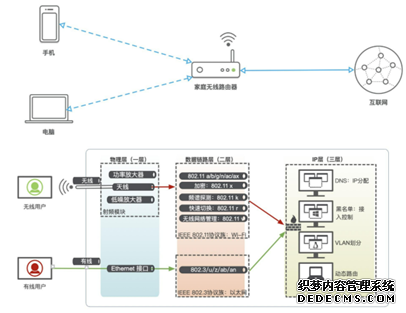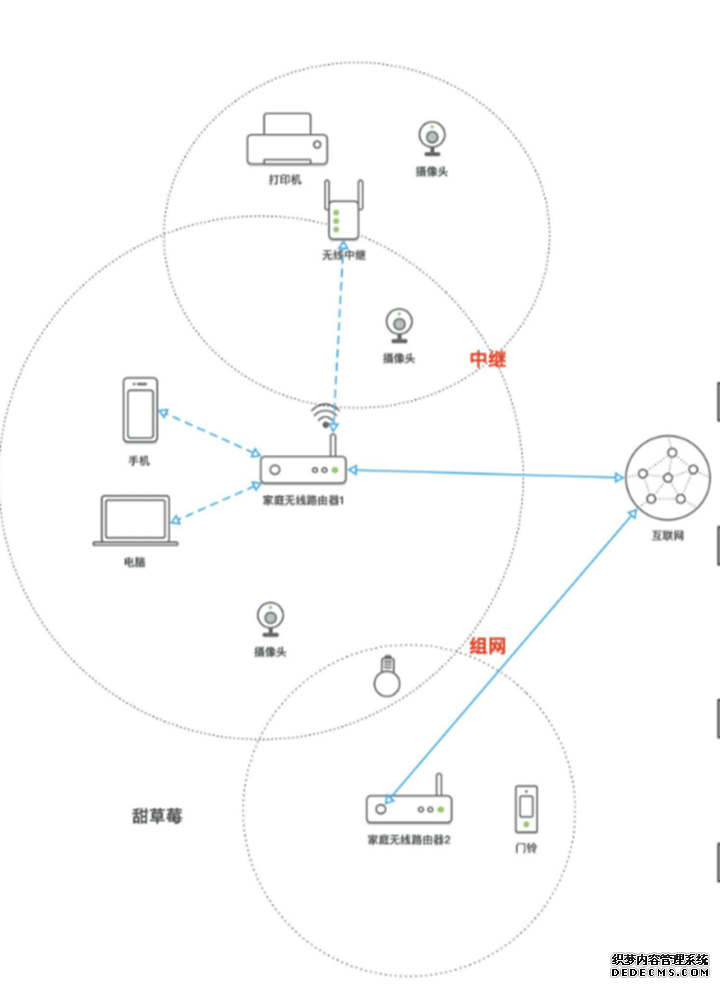 家庭无线网络组网,图源网络 上图是一个典型的家庭无线网络组图。可以看到,无线路由器将有线信号转为无线Wi-Fi信号,手机、电脑等终端设备通过连接Wi-Fi信号连接至无线路由器,随后无线路由器会为手机分配一个IP地址,以便在局域网内进行通信。而当手机需要与互联网上的其他设备进行通信时,手机会将数据发送到路由器。无线路由器会根据目标IP地址,将数据包转发到相应的网关设备上,继而再由网关设备将其转发到互联网上的目标设备。路由器会根据源IP地址,将响应数据包转发回到与手机相连的网络接口。手机收到响应数据包,根据协议解析数据包,将响应结果显示给用户。这就是我们手机通过Wi-Fi联网的一个全过程。在这个过程中,一切的基础都是需要我们的终端设备先连接上Wi-Fi。 因此,路由器的无线覆盖范围是用户最关心的问题。 当然,在这里我们有必要做出一个说明:家用无线路由器一般可以看做是一个涵盖路由器(NAT功能)、交换机(四个有线口)、无线AP(将有线转换成无线)以及防火墙功能(基本安全防护)的多功能设备。也就是说,一般情况下,家庭场景中通常通过单个设备控制无线设备的接入,也叫做单点部署方式。一个最大的问题,是在比较复杂的家庭环境中,其信号传输极其容易受到干扰。