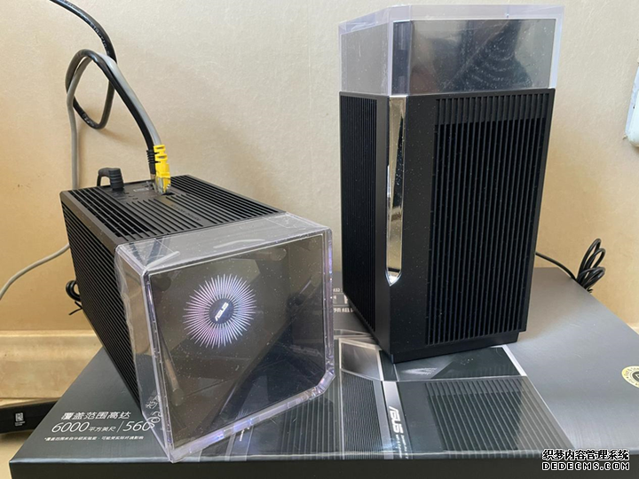 接下来有请路由器本器闪亮登场。可以看到华硕灵耀Pro AX11000 分布式路由器是两台一模一样的 XT12,两个一模一样的黑色立方体,顶部有透明的亚克力顶罩,通电后可以看到LED灯效(说实话,蛮好看的)。两个路由器型号和规格都相同,不分子母,可以独立使用,也可以作为AiMesh的主路由或者节点使用,就真一模一样。