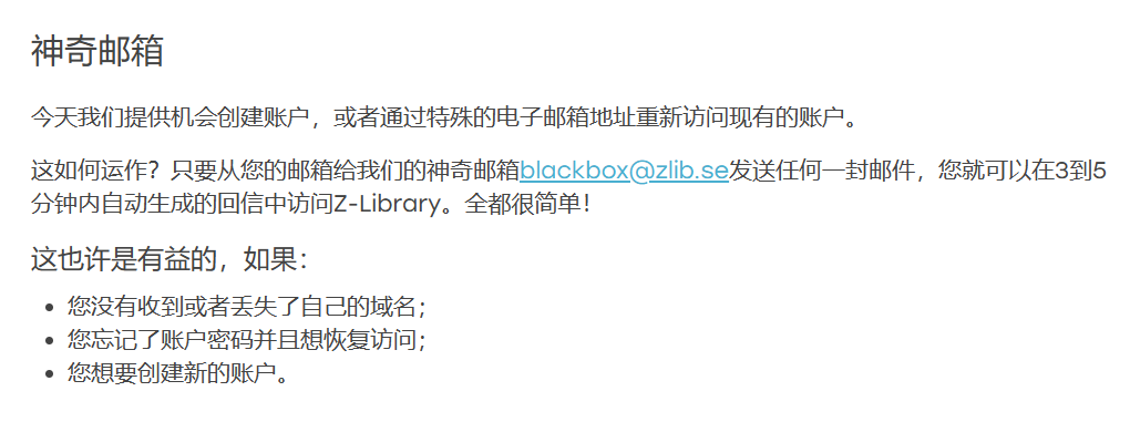 以上,都是咱们已知的内容,其实在这 3 个月里,Z-lib 还做了很多不失联的准备—— 1、神奇邮箱。 当你迷路的时候,只要给「blackbox@zlib.se」发上一封任意邮件,就能收到官网的链接。
