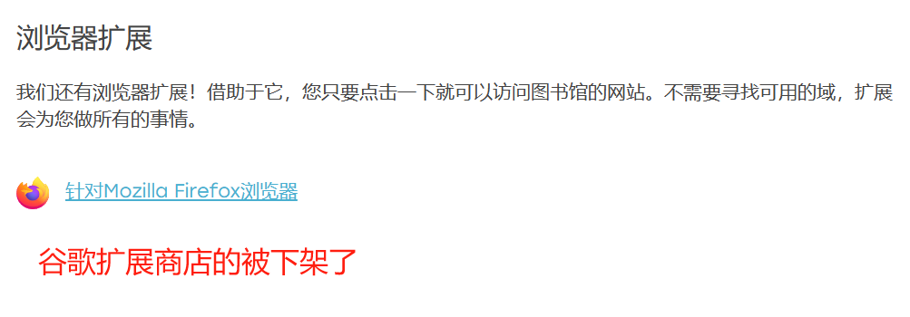 2、浏览器扩展。 说实话,邮箱这种救急方式,多少不符合咱们的使用方式了,Z-lib 官方其实还发布了浏览器扩展,原理就是点击后自动跳转可用域名。 但可惜的是,在 Z-lib 网站上提供的扩展里,只剩下了 Firefox 的扩展链接,而原先谷歌商店的扩展被下架了。