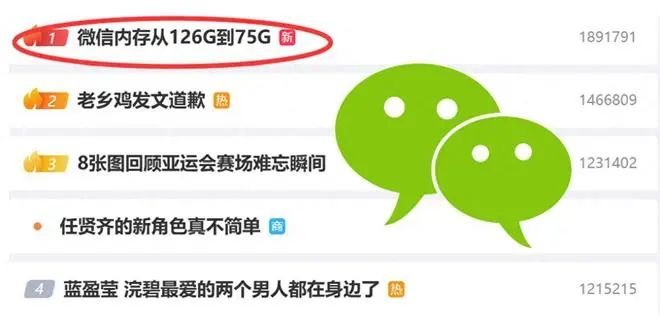 近日,#微信内存从126G到75G#这一词条突然登上了微博热搜第一。 事实上,类似的话题一直就有,那就是微信占用了太多的手机空间了,在很多人的手机里,微信永远是占空间最多的那一个APP。 而针对这一热搜,有网友评论称,这是微信在和苹果一起,联手“抢”大家的钱。