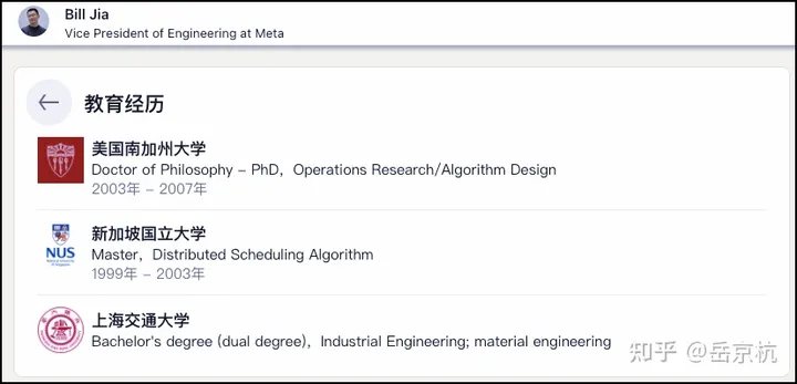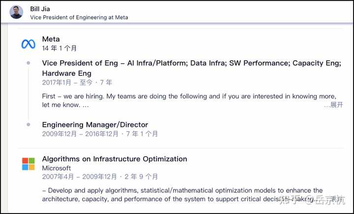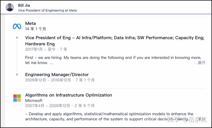 上班之后倒是挺顺利,先去了微软,三年之后跳槽Meta,一干就是14年,一直干到工程副总裁,负责AI/ML基础设施、数据基础设施、性能和容量工程以及硬件工程等基建型业务,也是框架大神,PyTorch就出自其团队,贾扬清在Meta也是向Bill Jia汇报。据最新消息,谷歌在挖他去负责AI方面的业务。