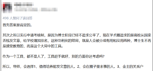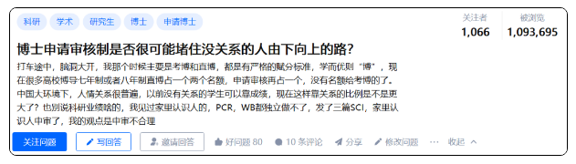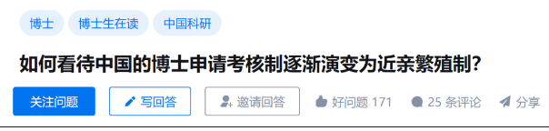 在这种大型的国家机构中,都存在这种“近亲繁殖”现象,不少网友也对博士申请审核制提出质疑:对于申请审核制这样的发展趋势,大家一眼就能看出,这种方式很大程度上取决于导师的人为主观思想,没有那么多的硬性考试条件等框框,所以很多人就觉得只要有金钱有地位的学生,很容易被录取,这不就是拼关系的时代了吗?而那些寒门学子要想挤进博士生的队伍中,真的是难于上青天了。